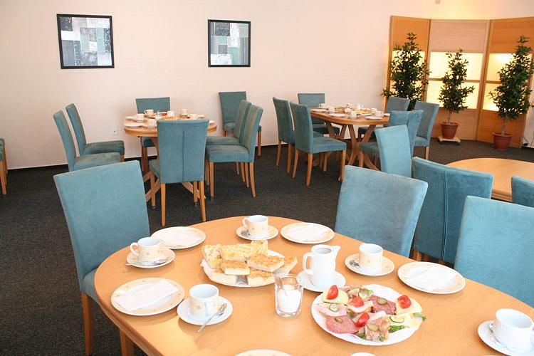 Die Nutzung des Café-Raumes ist kostenlos und kann eine Kaffeetafel mit bis zu 120 Personen Platz bieten.